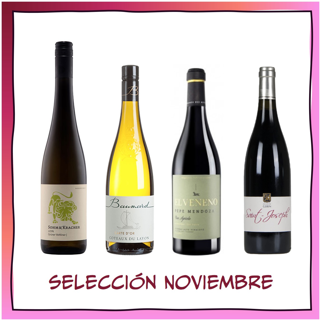Vinos de la competición de Noviembre: Sohm & Kracher Lion 2023 (14,50€); Domaine Des Baumard, Carte d´Or 2021 (17,50€); Pepe Mendoza El Veneno Tinto 2021 (27€); Jean-Michel Gerin Saint Joseph 2022 (37€).